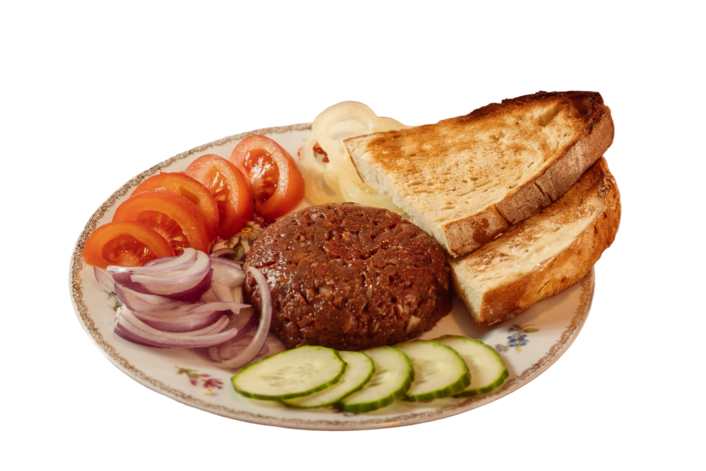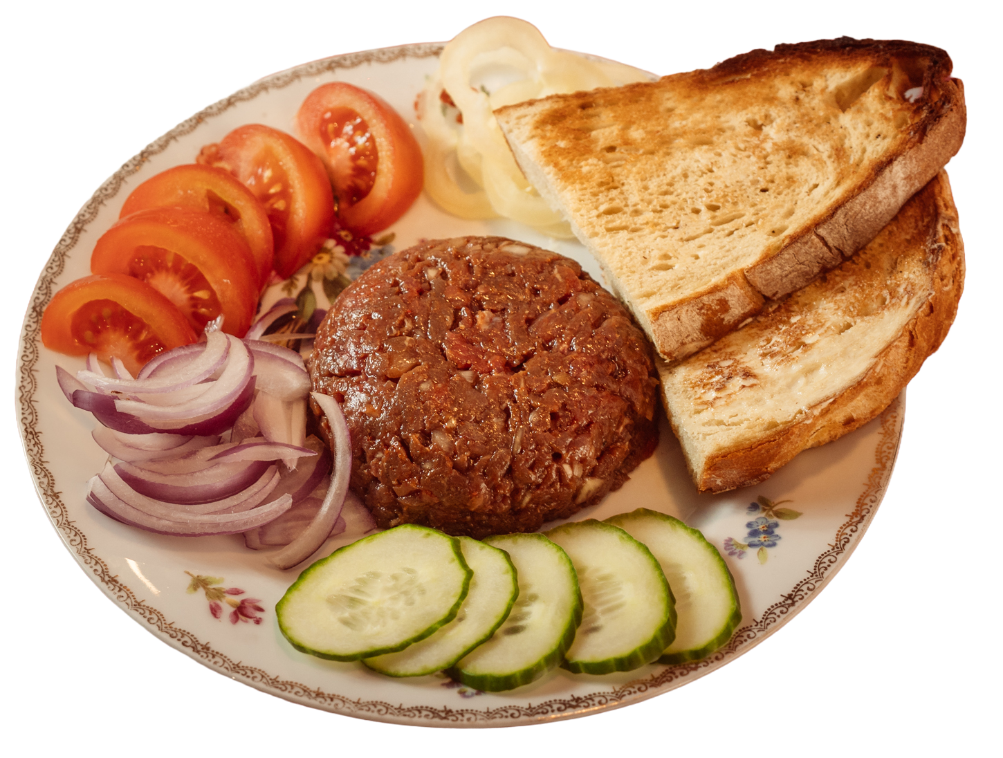 100g friss marhahús, tojássárgája, worcestershire-szósz, vöröshagyma, vaj, ketchup, mustár, pirítós