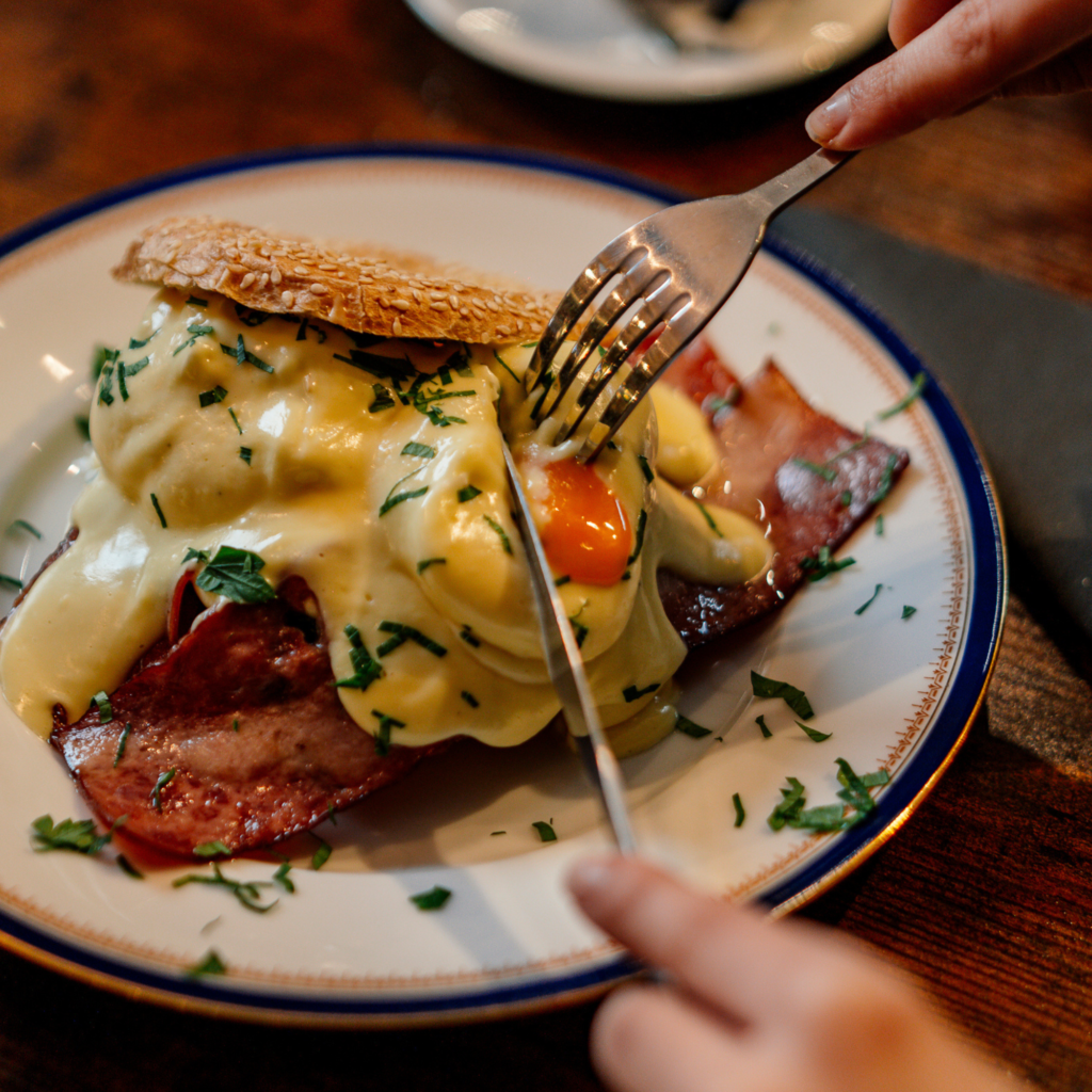 Ropogós bacon buggyantott tojással, krémes hollandi mártással tálalva.