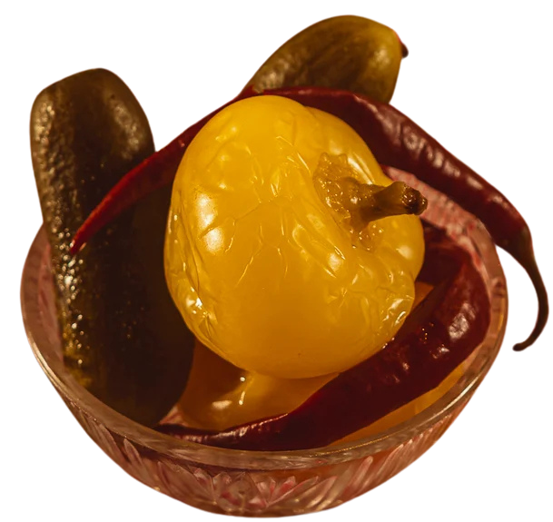 Savanyú uborkával, ecetes uborkával, kapribogyóval és tejfölös mártással tálalva.